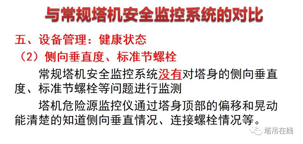 (1)超载监测 根据吊载时塔机顶部的偏移情况监测塔机的吊载情况,发生超载作业时系统报警,防止塔 机超载。(2)司机操作监督 根据塔机运行是塔身顶部的偏移和晃动,对司机的操作进行监督,当发生违章作业时予以 报警提醒,如斜拉斜吊、回转打反车、猛起猛放等违章操作,解决司机违章操作监督难的问题。(3)基础偏沉监测 根据塔身顶部的侧向偏移情况对塔机的基础沉降情况进行监测,当偏沉引起垂直度过大时 系统报警,提醒纠正,避免由于基础偏沉造成塔机侧向垂直度超差,解决基础不均匀沉降监测 难题。(4)塔身部分连接螺栓监测 根据塔机顶部的动态偏移监测塔身、转台部分连接环节(高强螺栓或销轴)的紧固情况, 当发生松动时予以报警,解决塔身、转台等连接环节(螺栓)松动监测的难题。(5)钢结构疲劳或损伤监测 根据塔机顶部的动态偏移监测塔身的钢结构疲劳情况,当超过安全线时系统予以报警。解 决塔机使用过程中塔身部分、转台部分损伤的监测问题。(6)塔机配重监测 根据塔机顶部的前后偏移量来判断塔机的配重是否合适,避免塔机配重重量偏差过大造成 安全事故,解决塔机配重重量是否合适的监测难题