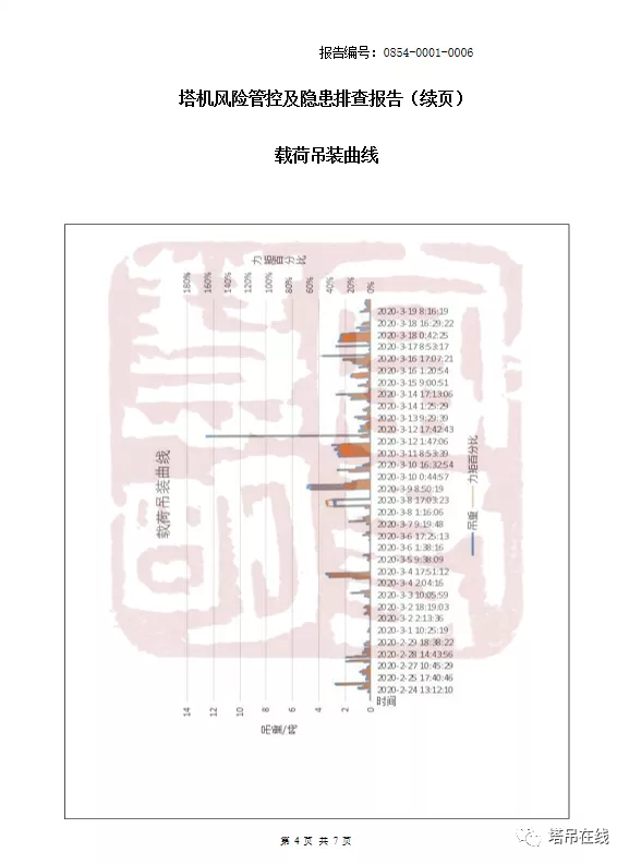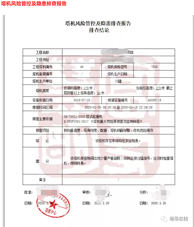 塔机危险源监测仪实时监测采集:(1)基础不均匀沉降(2)塔身结构变形及螺栓的松动监测(3)司机违章操作(斜拉斜吊、猛起猛放(4)大臂钢结构疲劳变形(5)测量塔身顶部的晃动量、偏移量,随着塔机疲劳状态加剧,必然晃动量变大,当晃动量超出安全偏移值时,刚度仪传感器就会报警。定期出塔机危险源监测报告